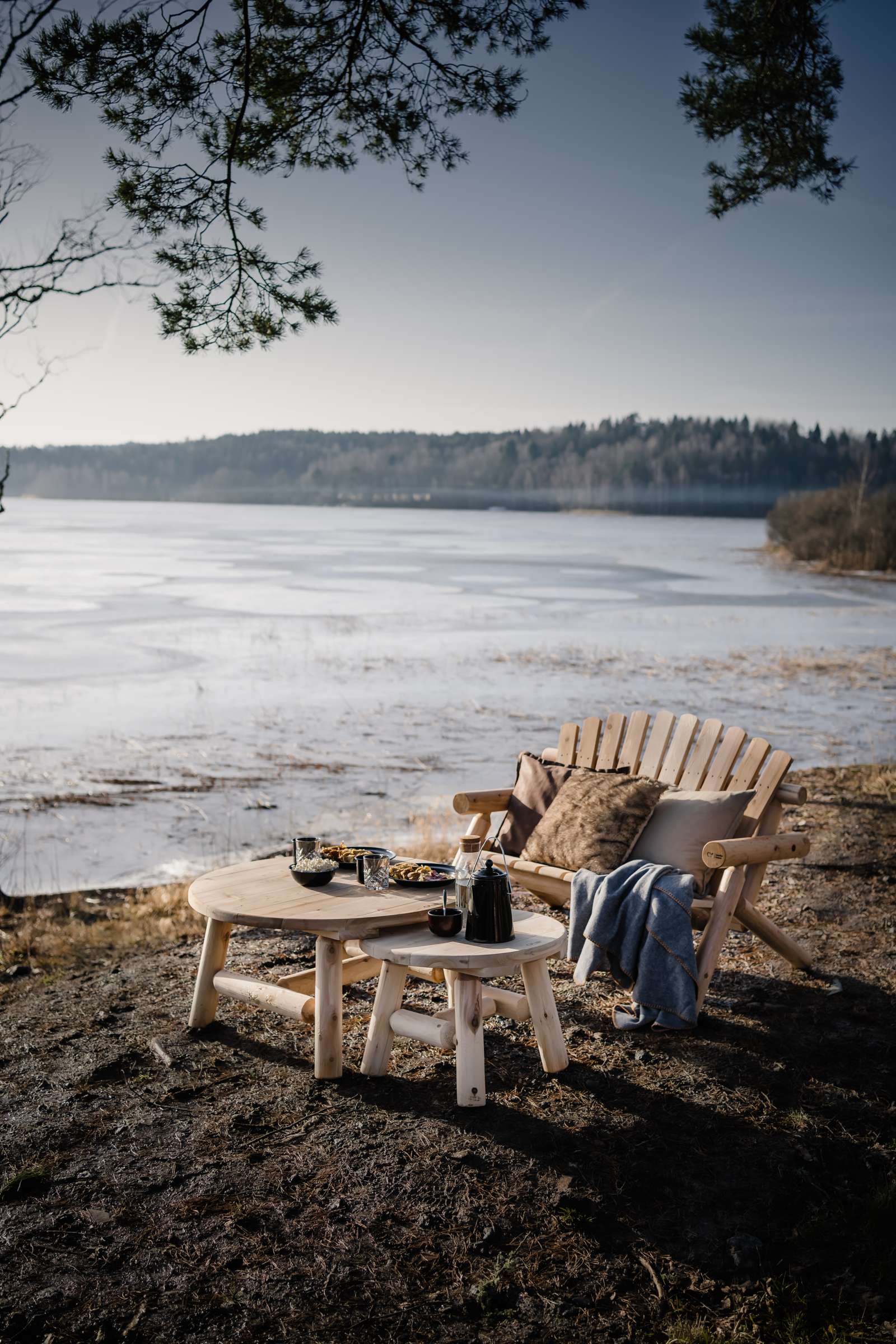 Rustikt rundt sidebord i ubehandlet sedertre, med ramme i rundstokk. Passer godt sammen med resten av Log-serien. Fint til avlastning.