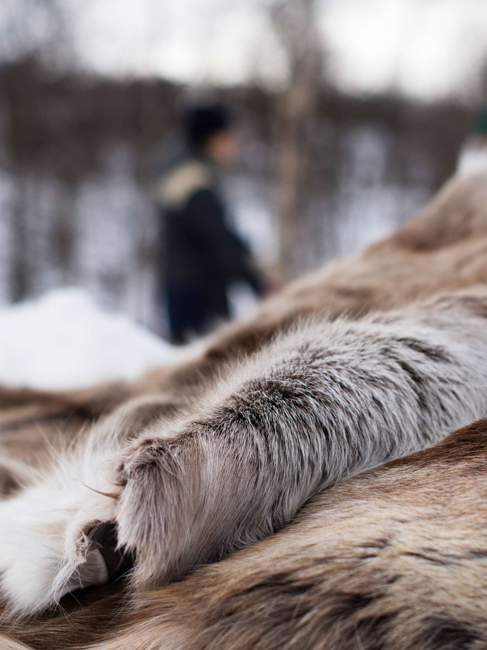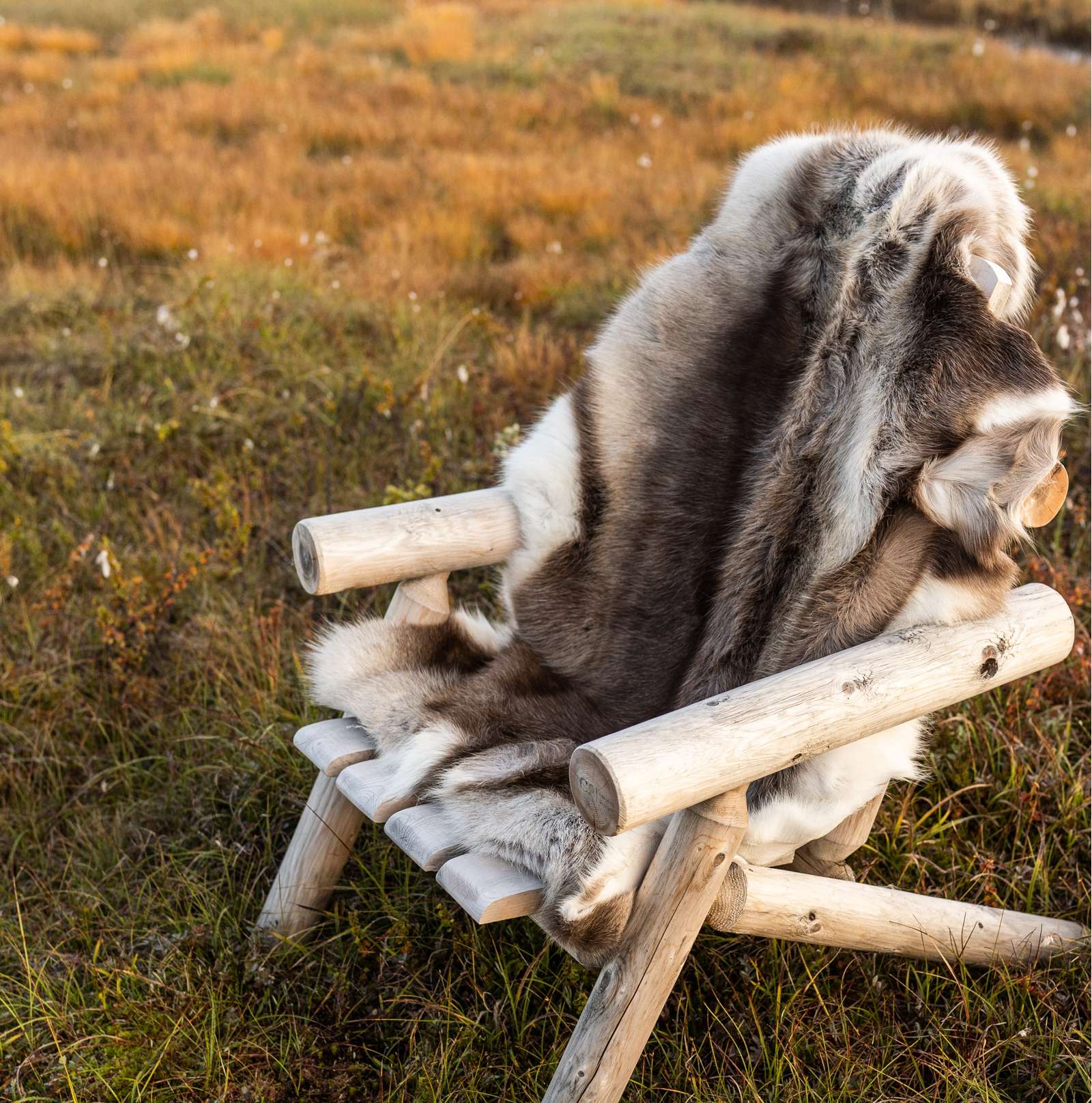 Norsk reinskinn. Garvet og impregnert for utendørs bruk. Svært god isolasjon mot kulde. Hvert skinn har sin unike fargevariasjon. For lagring rulles skinnet i sammen med hårsiden innover, fra nakken og ned.